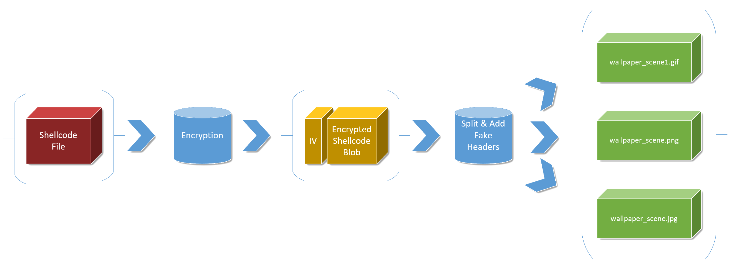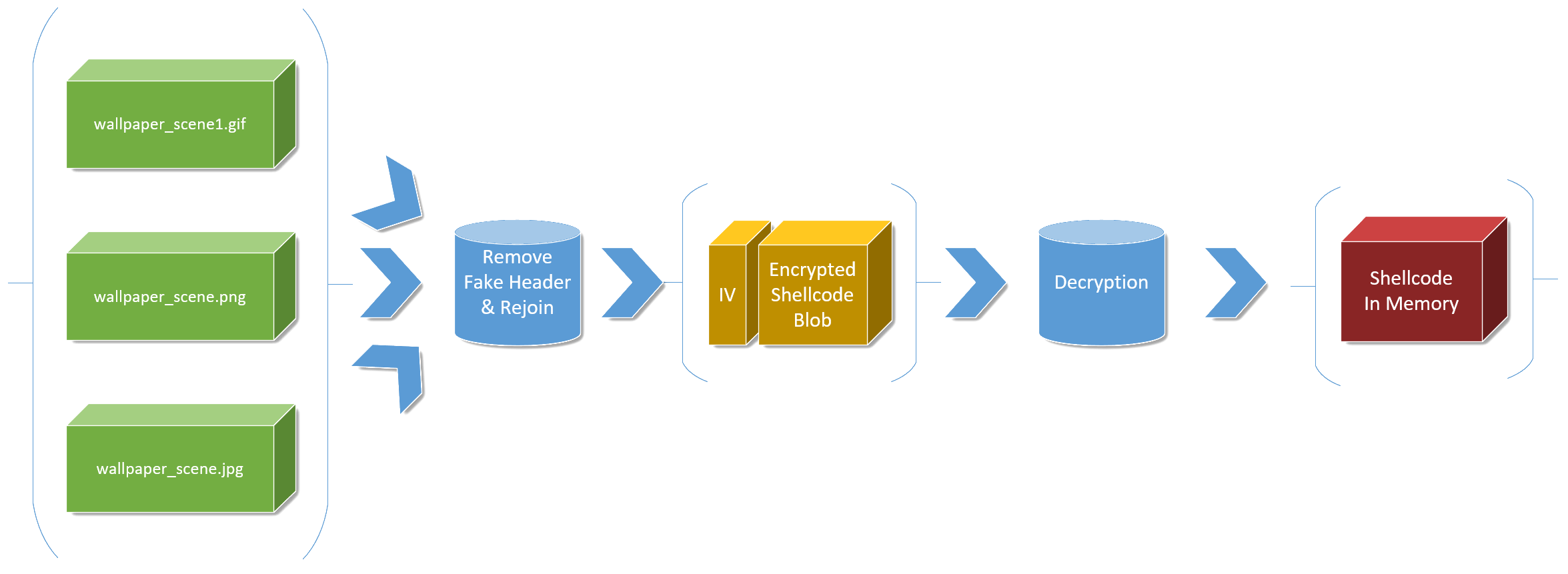 The fake image files containing the shellcode, and the decryption method (e.g. executable, service executable, or dll) are loaded onto the target. Once executed, the loader searches for and reads the source image files.The numerical integer in the file name also indicates the shellcode fragment position. The fake header is removed from each file, and the encrypted fragments are combined ready for decryption.