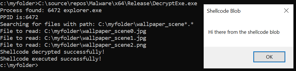 }Once the combined and decrypted shellcode is in memory (stored in a <BYTE> variable), the shellcode can then be executed or injected using any number of common WinAPI execution methods.