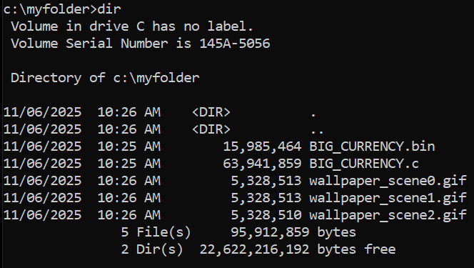 }Execution of the compiled code results in three files created, with the randomly chosen header, and associated file suffix:
