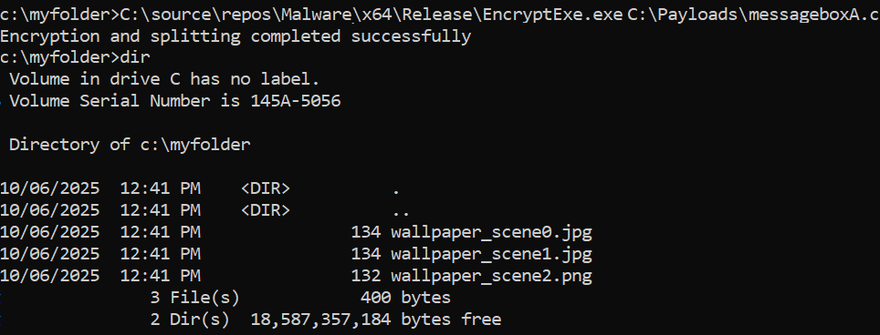 The shellcode is read in by the encryption program, and encrypted in whole, and split across three separate binary files, each containing an encrypted fragment with a fake file header. These fragments are stored with a small custom header (e.g., 16 byes) to include metadata such as the fragment size and offset. Once the files are created, they can be uploaded to the target system, ready for consumption by the decryption program.